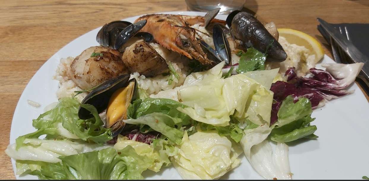 Les parties se terminent petit à petit, et nous nous dirigeons vers le restaurant pour clore cette belle soirée. Au menu : un risotto bien crémeux, garni de coquilles Saint-Jacques, d’une belle gambas et de quelques moules. Puis, pour finir en douceur, un gâteau au chocolat avec son croustillant, qui a fait l’unanimité.