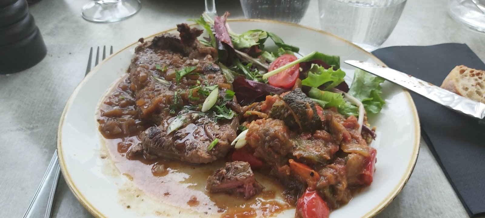 L'alcool aidant et la chaleur, nous échangeons rapidement avec nos voisins ou voisines en dégustant une entrée briarde suivie d'une viande au goût des invités agrémentée d'une ratatouille et de frites.