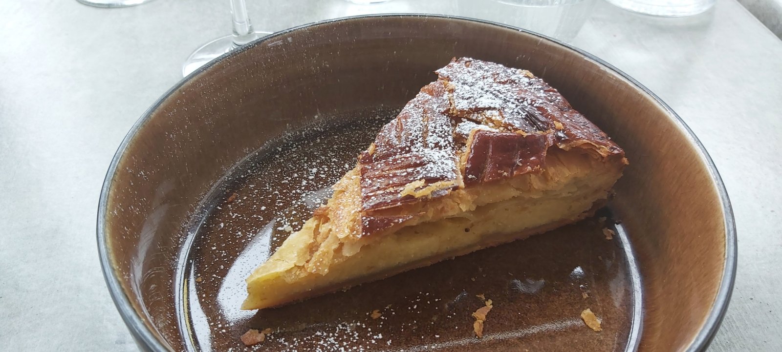 Arrive le dessert. Les galettes maison sont saupoudrées de sucre blanc accompagnées d'une coupe de champagne suivie du café ou du thé.